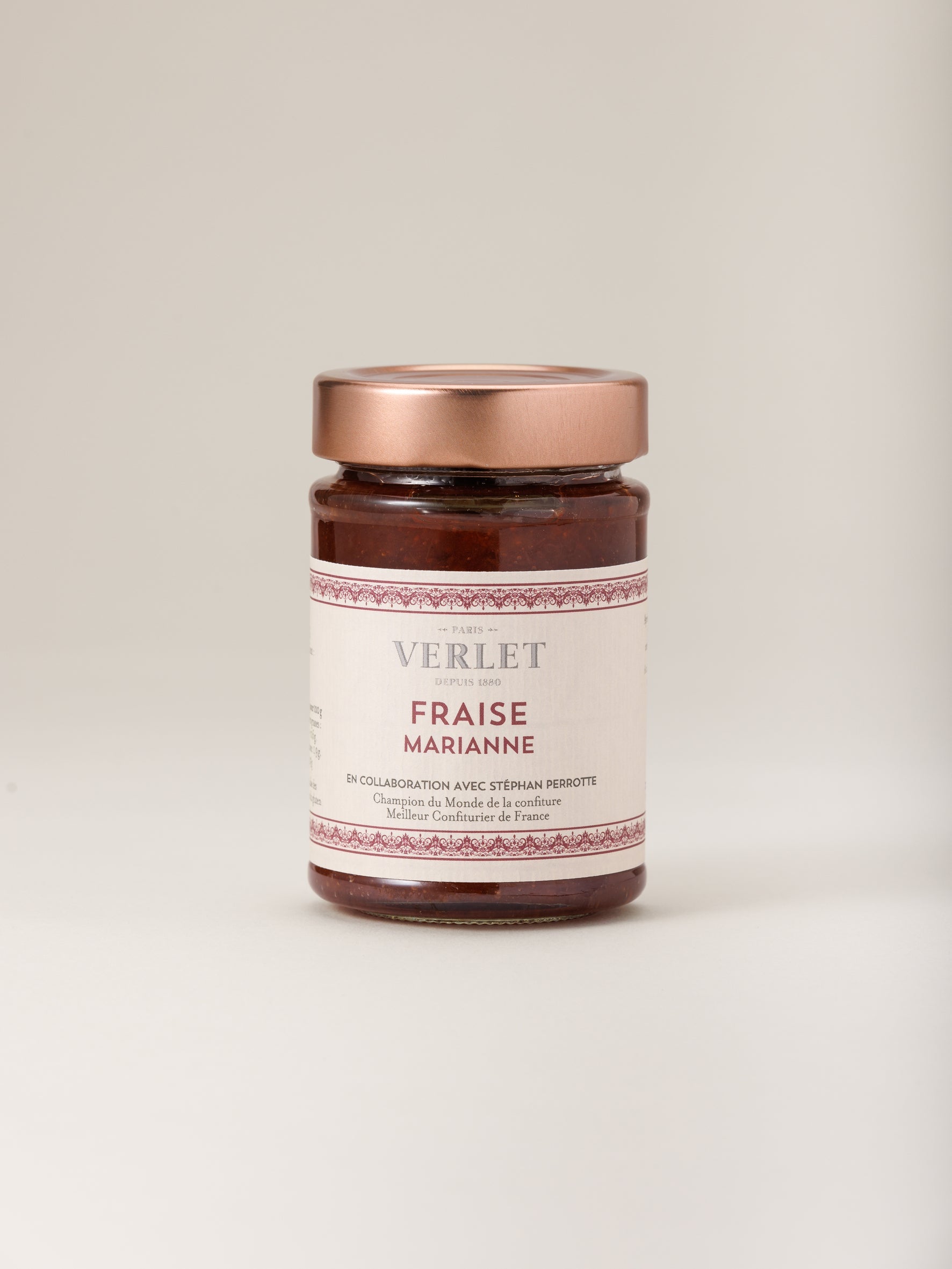 Découvrez la Confiture de Fraise Marianne de Verlet, en collaboration avec Stéphan Perrotte, Champion du Monde de la confiture et Meilleur Confiturier de France. Préparée de façon artisanale, sans conservateurs ni colorants artificiels, avec des fraises Marianne soigneusement sélectionnées, cette confiture dévoile des arômes intenses et une texture fondante. Idéale pour vos petits-déjeuners et goûters, elle se marie à merveille avec une tasse de thé ou de café d'exception de Verlet.