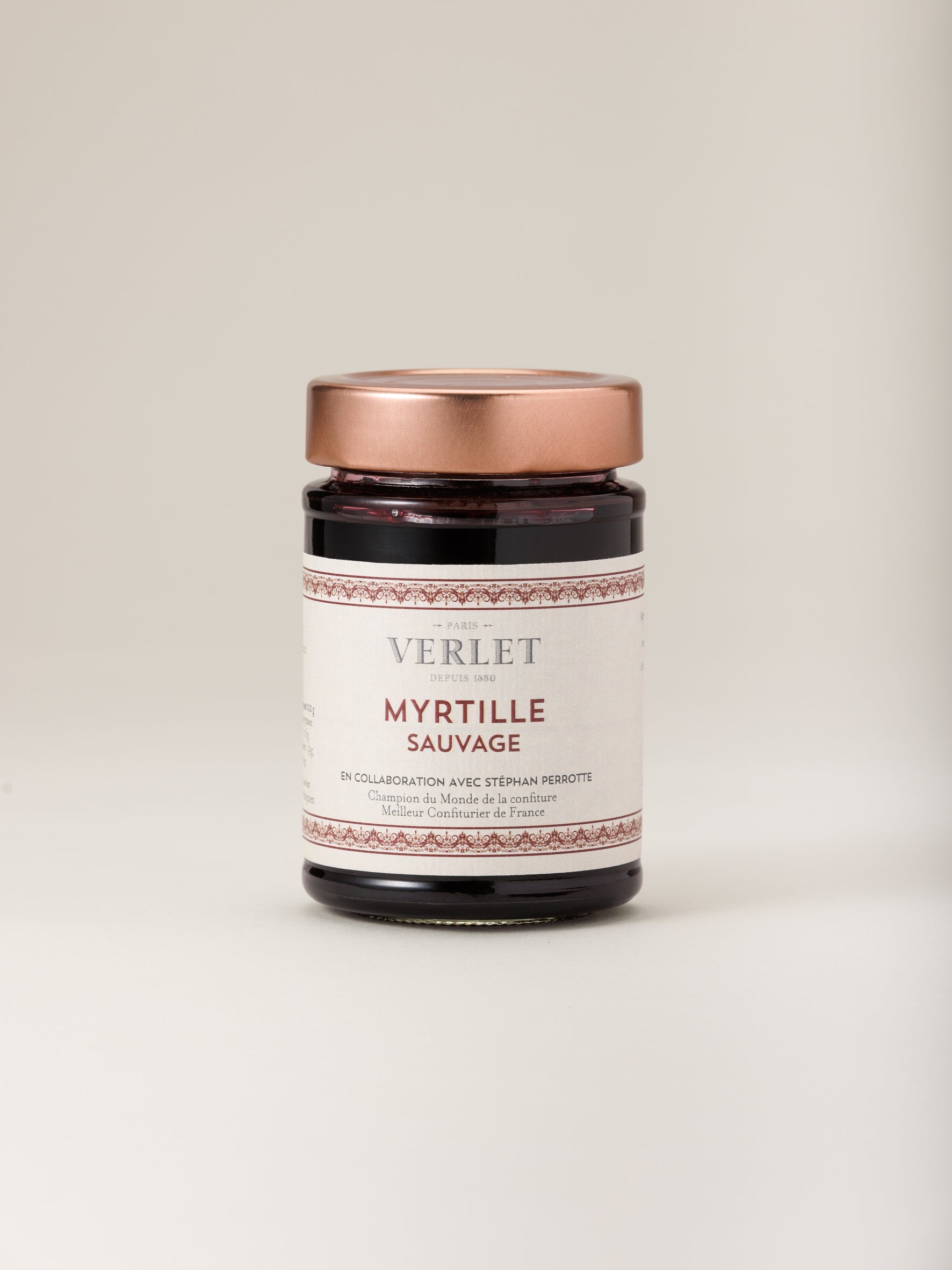 Découvrez la Confiture de Myrtille Sauvage de Verlet, en collaboration avec Stéphan Perrotte, Champion du Monde de la confiture et Meilleur Confiturier de France. Préparée de façon artisanale, sans conservateurs ni colorants artificiels, avec des myrtilles sauvages soigneusement sélectionnées, cette confiture révèle le goût de ce fruit naturellement sucré et légèrement acidulé. Idéale pour vos petits-déjeuners, goûters ou recettes pâtissières, elle se marie à merveille avec une tasse de café ou de thé d'exception de Verlet.