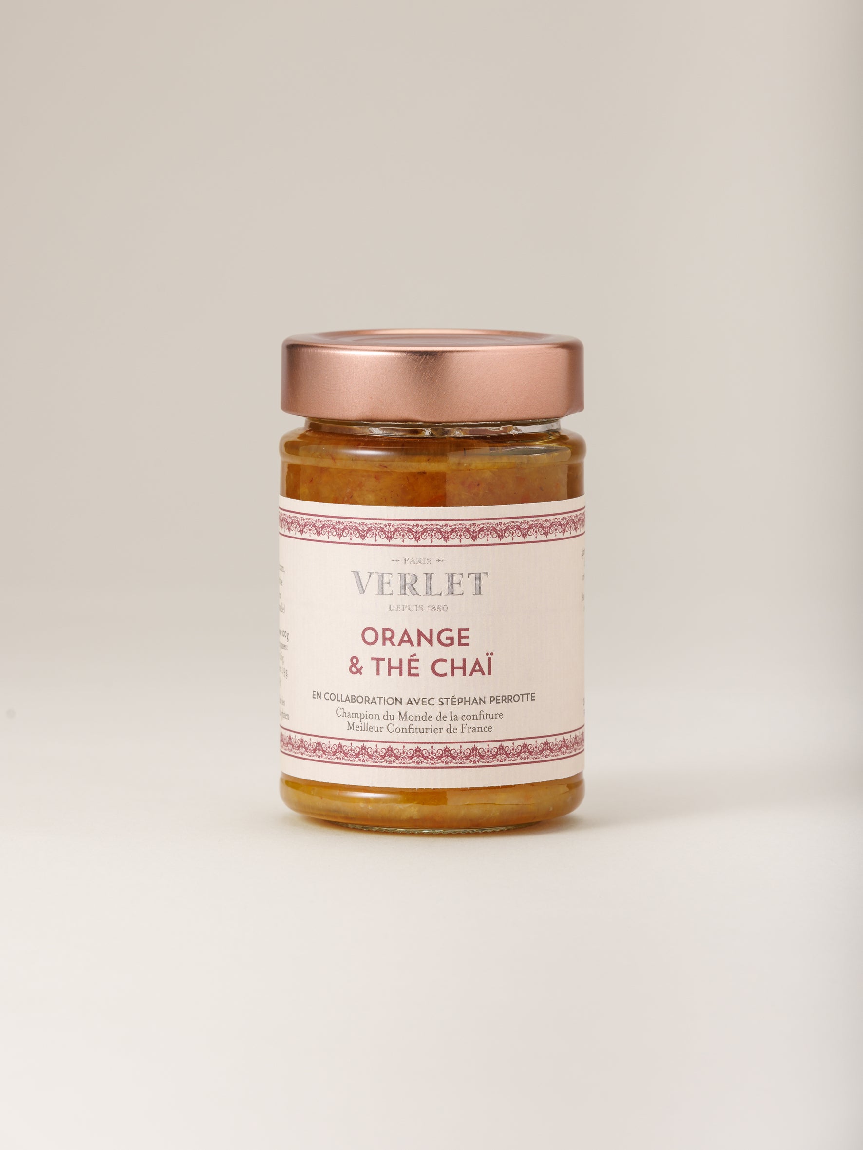 Notre confiture Orange & Thé Chaï en collaboration avec Stéphan Perrotte, Champion du Monde de la confiture, Meilleur Confiturier de France. Dans cette création exclusive, Verlet et Stéphan Perrotte réunissent leurs savoir-faire : un savant mélange de thé d’Assam et d’épices indiennes comme la cardamome, la cannelle et le gingembre, marié avec l’amertume de l’orange...
