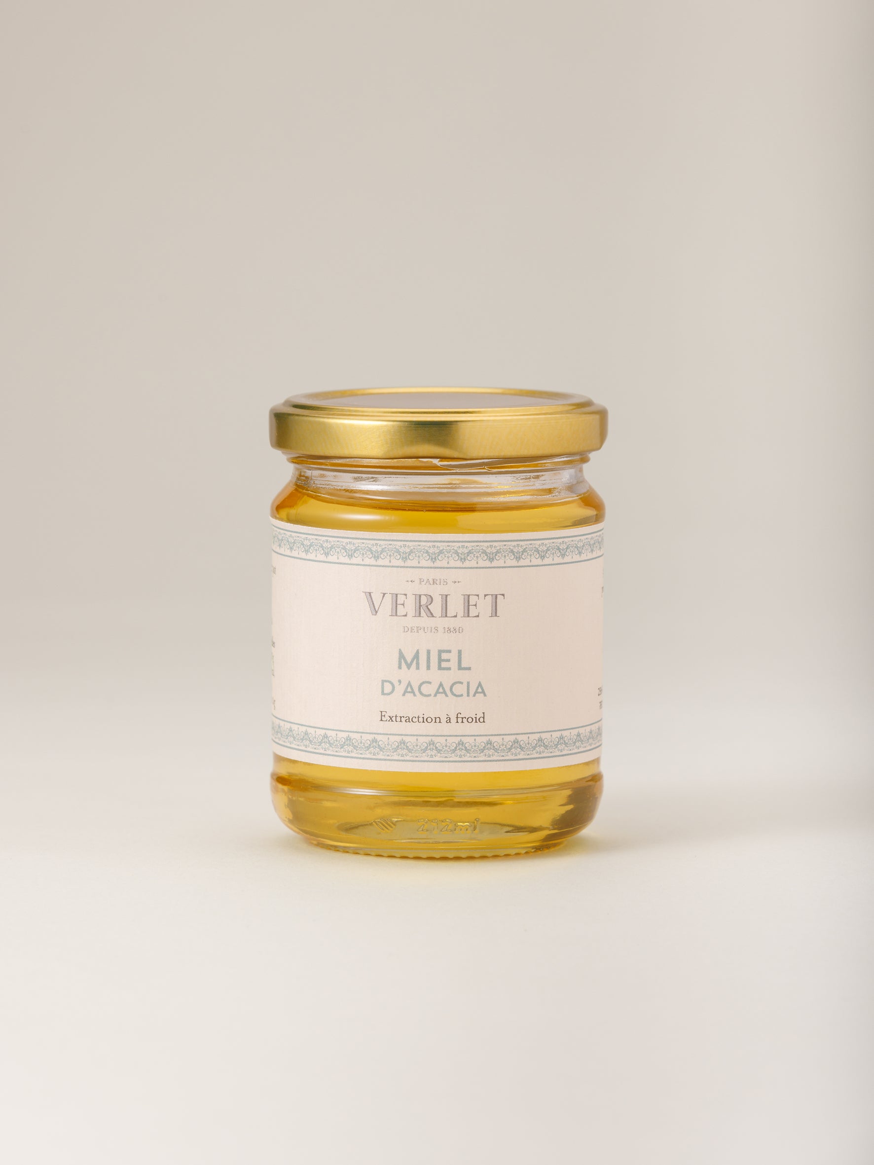 Extrait à froid et sans aucune transformation, le Miel d'Acacia préserve toute la richesse naturelle de ses arômes. Idéal pour sucrer vos infusions, yaourts, tartines ou recettes, il apporte une touche douce et élégante à chaque moment, et se marie à merveille avec une tasse de thé ou de café d'exception de Verlet.