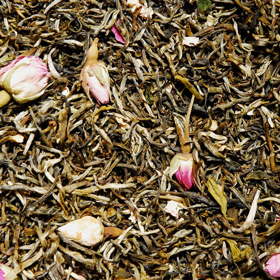 Thé blanc riche en bourgeons duveteux, agrémenté d'élégants boutons de roses et relevé par un léger arôme de litchi. Ce thé révèle une liqueur jaune clair aux reflets rosés et développe des notes subtiles végétales, fleuries et fruitées.