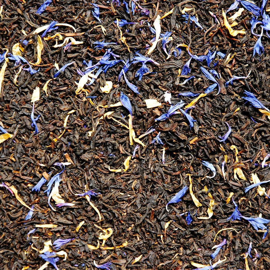Thé noir, pétales de bleuet, écorces d'orange, arôme bergamote, arôme pamplemousse.